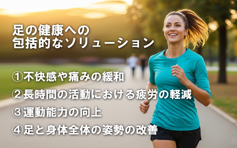 足の痛みや疲労を軽減し、パフォーマンスを向上させる総合的なフットケアソリューションを提供し、信頼されるパートナーとして足の健康を支えます。