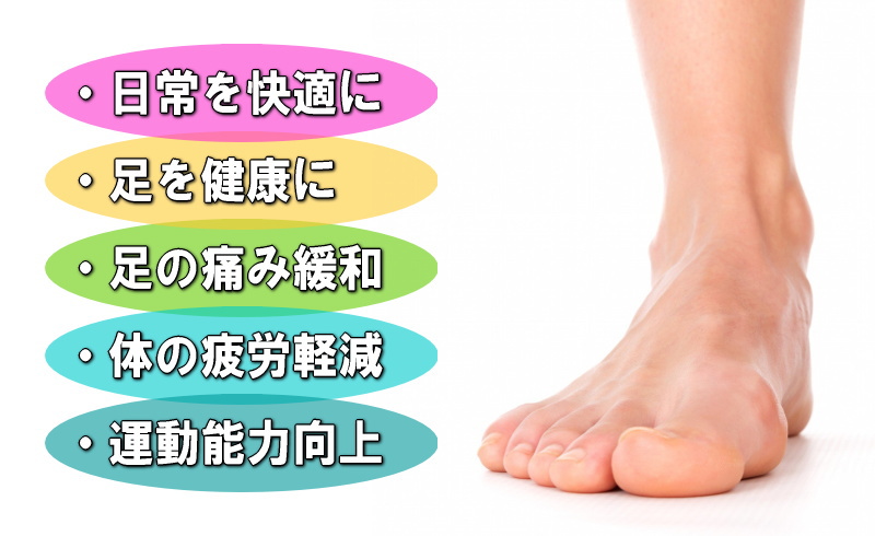 | 扁平足 外反母趾 | アーチサポート 体重分散 | 痛み緩和 症状の改善 | 扁平足や外反母趾など 足の症状を抱える人 |